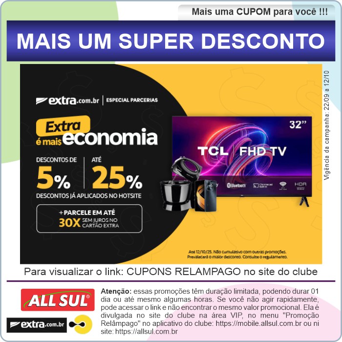 Lembramos que estas promoções de última hora tem duração de UM DIA e em grande parte duração de horas. Em muitos casos o link não sai do ar, mas o valor volta ao normal e o cupom fica expirado. Portanto, se houver interesse entre no link o mais breve e faça a sua compra. O desconto proposto é sobre o site oficial da loja mas em alguns casos fica sendo um dos valores mais baixos. Os links das promoções são divulgados aqui no site. Pode ser vantajoso adquirir vários produtos de uma vez, pois o custo do frete acaba sendo significativamente reduzido. Seria o caso de produtos de alimentação e higiene